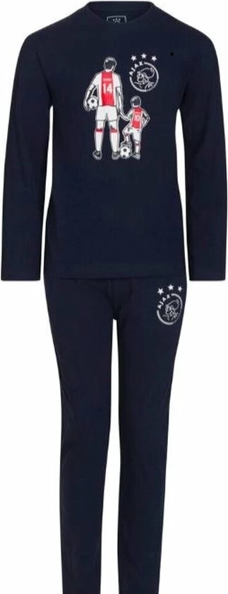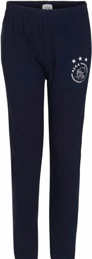 Droom weg in deze fijne AFC Ajax Kinderpyjama. De set bestaat uit een top en broek in de kleur donkerblauw / navy. De top heeft een ronde hals, lange mouwen en print op de borst. De broek heeft een elastische tailleband en een print op het bovenbeen. De achterzijde van de pyjama is effen.
