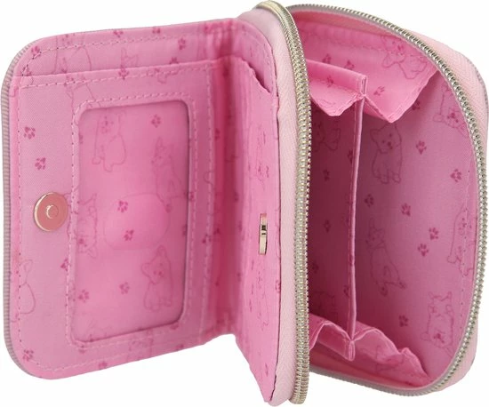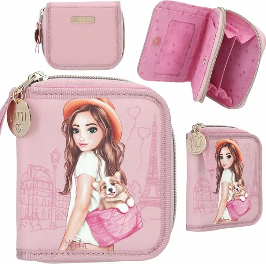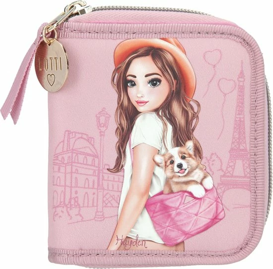 De TOPModel portemonnee Corgi schittert je prachtig tegemoet in roze en met een schattige hond en model afbeelding voor een achtergrond van Parijs. Het vak voor munten is af te sluiten met een rits, de diverse vakken voor pasjes (incl. transparant naamkaartvakje) worden bij elkaar gehouden door een drukknoop. Met leuke all over hondenprint binnenin en goudkleurige munt aan de rits. Materiaal: 100 procent polyester.