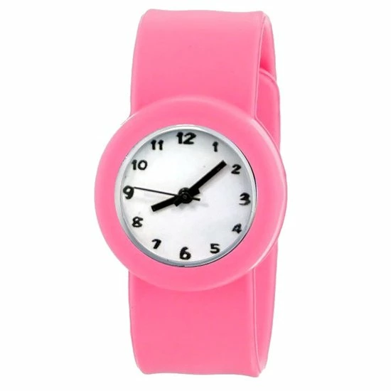 Een Slap On Mini horloge sla je eenvoudig om je pols heen en de band vormt zich direct perfect om je pols. Deze mini uitvoering is zeer geschikt voor jonge kinderen. Het horloge heeft een kortere band dan de standaard uitvoering en is voorzien van een kunststof uurwerk. De band is bekleed met siliconen, licht van gewicht, allergie-vrij en draagt ook nog eens prettig. De breedte van de band is 20mm. Het kunststof uurwerk (zonder glas, veilig voor kinderen) kan eenvoudig uit het siliconen omhulsel worden gehaald wanneer u de batterij wilt verwisselen. Zeer leuk voor jonge kinderen om ze spelenderwijs te leren klok kijken.