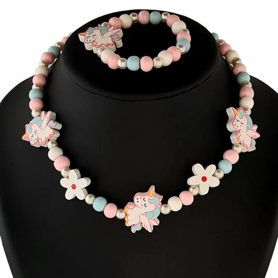 Een vrolijke kinderketting en kinderarmband, gemaakt van houten kralen en bedeltjes, acryl kralen en elastiek.