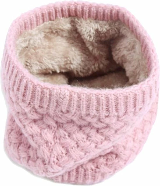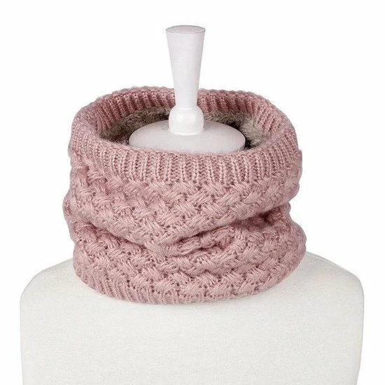 De colsjaal heeft een ingebreid kabelpatroon en zachte binnenvoering van teddy. De breedte is 25 cm en de hoogte is +/-22 cm.