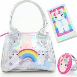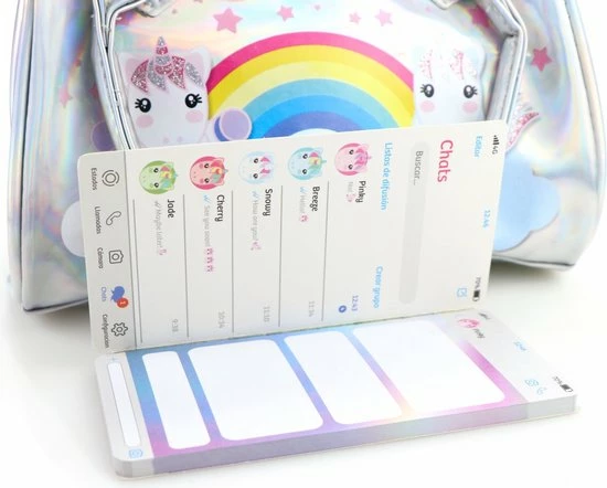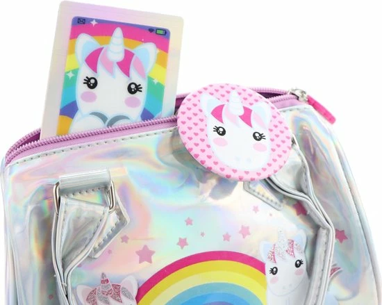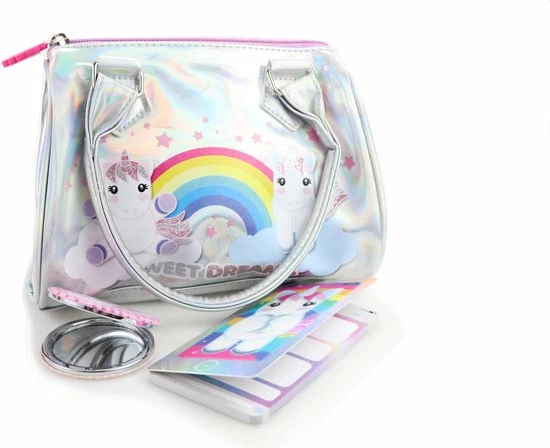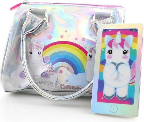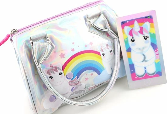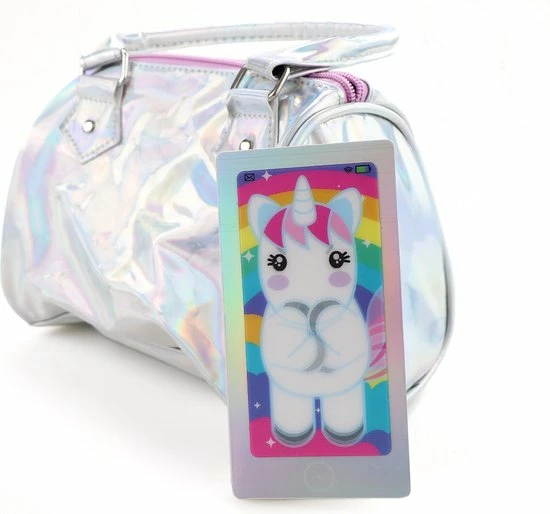 Dit is écht een leuke draagtas/handtas voor jouw kleine meid. Deze Unicorn cadeau set bevat 1 parelmoerachtige schoudertas, 1 make-up spiegel en 1 parelmoer schrijfboekjes met hologram afbeelding (kaart met beweging) in de vorm van een smartphone. Jouw kleine meid zal zich uren een echte dame voelen.