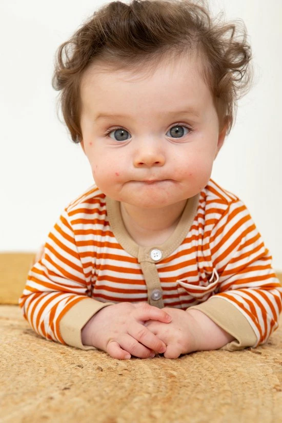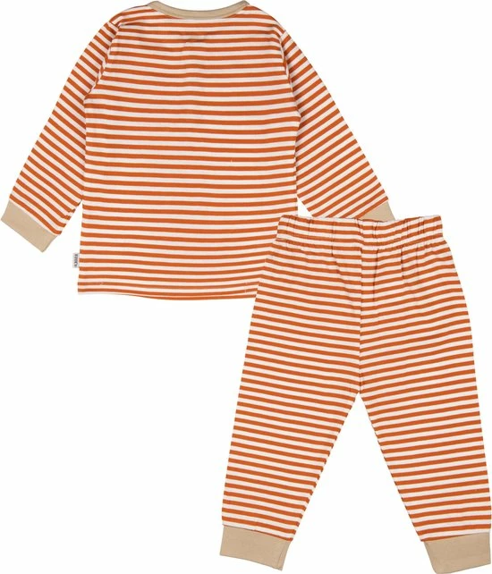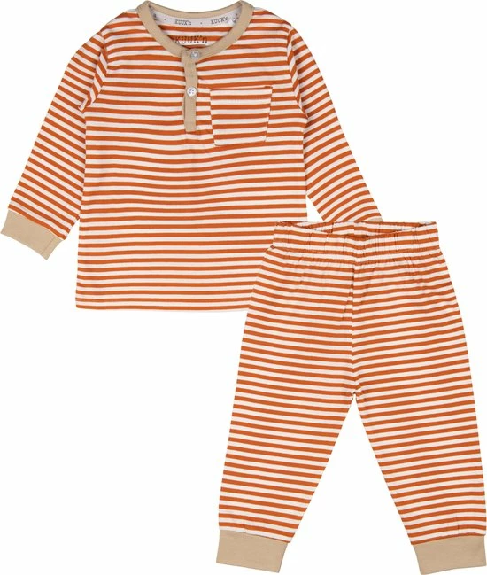 Deze vrolijke unisex pyjama van Kuuk’n heeft een top met lange mouwen en een lange broek. Zowel de top als de broek hebben zand kleurige contrast boorden. De pyjama is gemaakt van een zachte katoenen stof en heeft een sunset orange met offwhite streepje. Het pyjama broekje heeft een elastische tailleboord en het jasje een polo voorsluiting.