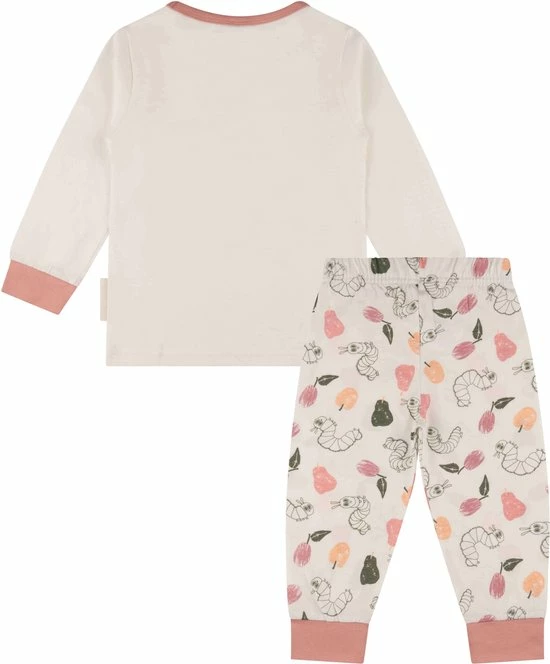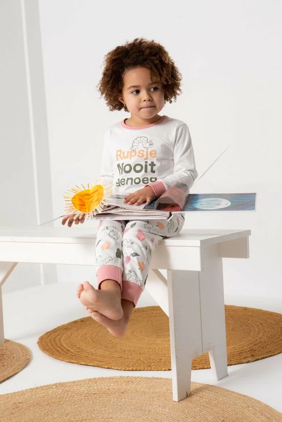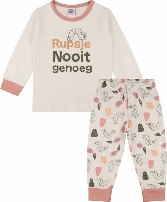 Deze leuke meisjes Rupsje Nooitgenoeg pyjama heeft een top met lange mouwen en een frontprint en een lange broek met allover print. Wie kent niet het beroemde Rupsje dat altijd honger heeft geschreven door Eric Carle en waarvan je nu ook deze leuke vrolijke pyjama kunt krijgen. De pyjama is gemaakt van een zachte katoenen stof en elastische roze boordjes en biesjes voor een goede pasvorm.