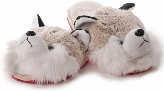 Witte/grijze husky hond instap pantoffels/sloffen voor kinderen. Instappantoffels/instapsloffen in de vorm van een husky hond, gemaakt van zachte pluche stof. Met rode anti-slip zool. Materiaal: 100% polyester, rubberen zool. Dieren huskies/huskys honden pantoffel/slof – Dierensloffen/dierenpantoffels huissloffen voor jongens/meisjes – Huispantoffels – Instappers – Instapsloffen/instappantoffels. Heerlijke warme voeten met onze collectie kinderen pantoffels en sloffen.