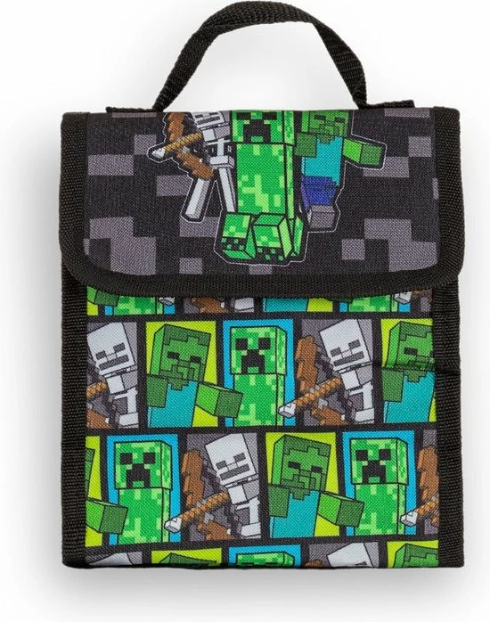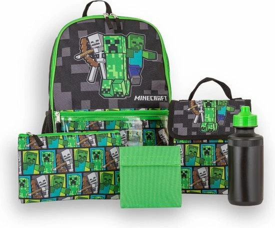 Op de voorkant van de rugzak maar ook op de andere onderdelen van de set vind je de Creeper, Zombie en Skeleton.