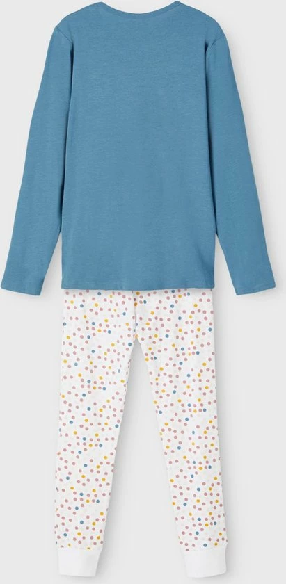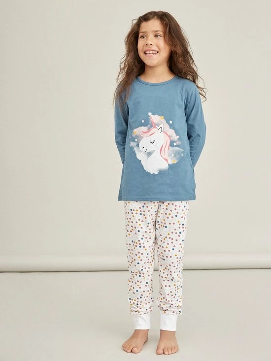 Meisjes pyjama van het merk name it. De pyjama bestaat uit een shirt met lange mouwen en een lange broek. Beide gemaakt van organisch katoen. Het shirt is blauw, heeft een ronde halslijn en een eenhoorn op het voorpand. De broek heeft een all over gekleurde stippen print.