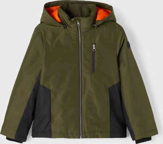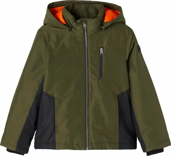 Een gevoerde colorblock jas voor jongens van name it. De jas heeft een ritssluiting en afneembare capuchon. De jas is voorzien van reflecterende details en drie zakken.