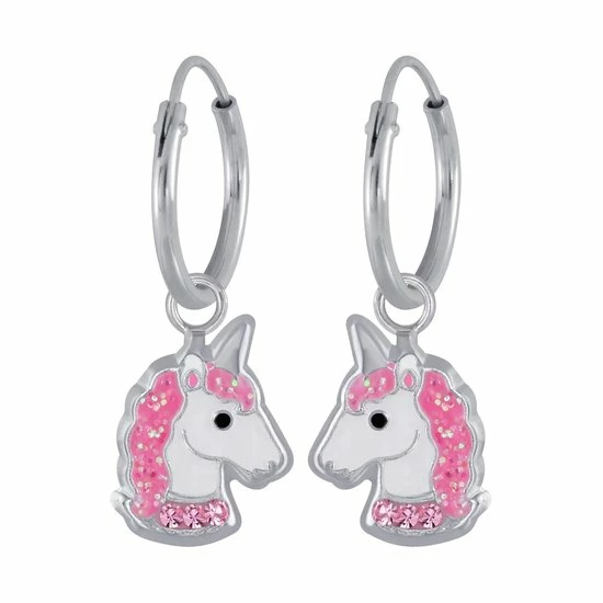 Oorbellen meisje | Kinderoorbellen meisje zilver | Eenhoorn oorbellen | Zilveren oorringen met hanger, hoofd van eenhoorn met roze kristallen halsband | WeLoveSilver