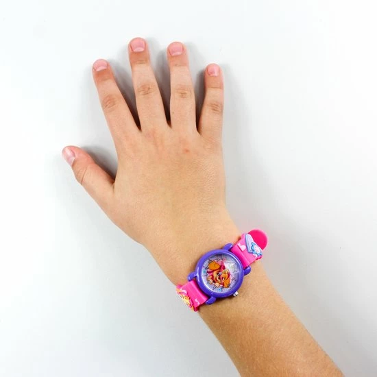Met dit leuke horloge van Paw Patrol uit de Favorite Pups collectie met komt je kindje nooit meer te laat op school of bij de sportles. Tenminste, dat is de bedoeling. De bandjes zijn donkerroze en zijn gemaakt van rubber. Het horloge heeft een wijzerplaat met de vrolijke viervoeter Skye. De grote en kleine wijzer zijn donkerroze en de secondewijzer is door de lichtblauwe kleur ook duidelijk zichtbaar. Bovendien is het horloge ook erg leuk om cadeau te geven!