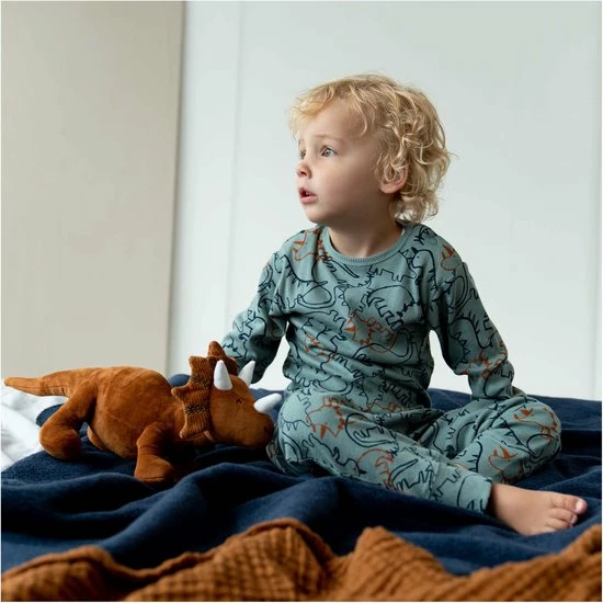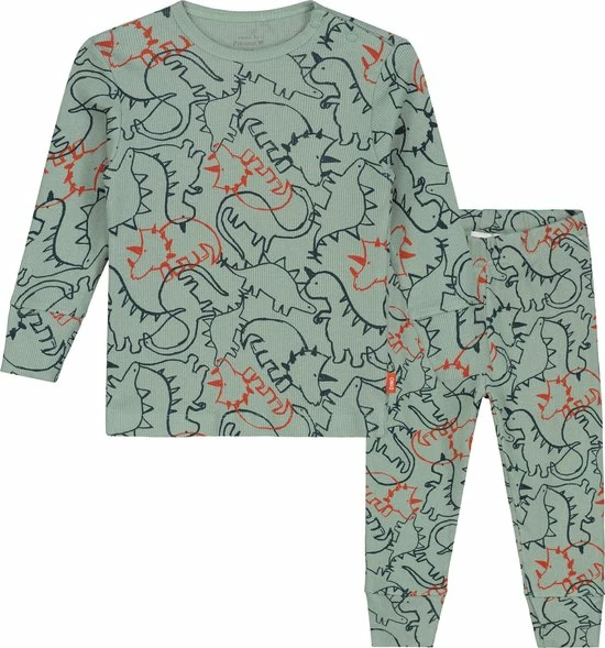 Deze Prénatal peuter pyjama is gemaakt van biologisch katoen. De pyjama is gemaakt van een mooie rib kwaliteit en is groen van kleur met een leuke all over dino print. Door de knoopsluiting op de schouders is het pyjamaatje gemakkelijk aan en uit te trekken bij je kleintje. De pyjama sluit aan bij het Dino thema van Prénatal. Materiaal: 100% biologisch katoen. Wasvoorschrift: binnenstebuiten wassen op 30 graden met gelijke kleuren. TOG waarde: 0.5 TOG.
