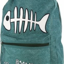 To the Bone and back! Met deze coole fishbone op je rug ben je too cool for school!. De tas is gemaakt van groen canvas, met een allover waves-print en mega Fishbone. De rugtas neem je eenvoudig mee aan de verstelbare schouderbanden. De tas heeft een klein voorvak en een groot hoofdvak waar je school- (A4 schrijfblok past!) of sportspullen makkelijk inpassen.