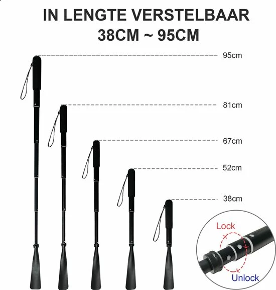 Deze extra lang uitschuifbare schoenlepel met een zacht handvat en draagkoord, kunt u naar binnen intrekken tot 38cm en uitrekken tot 95cm. Schoenlepel kunt u 4 positie instellen en vast zetten om de gewenste positie te bepalen die het beste bij u situatie past, zonder te bukken of te draaien. Gemakkelijk te dragen en heeft brede monduiteinde voor stevig en gemakkelijk gebruik. - Duurzame materiaal en uitstekend vakmanschap