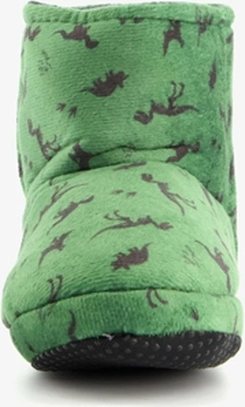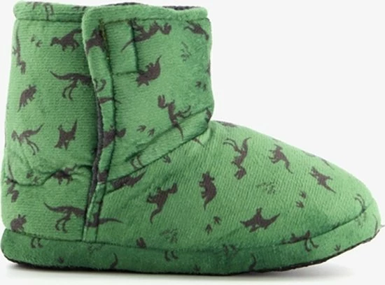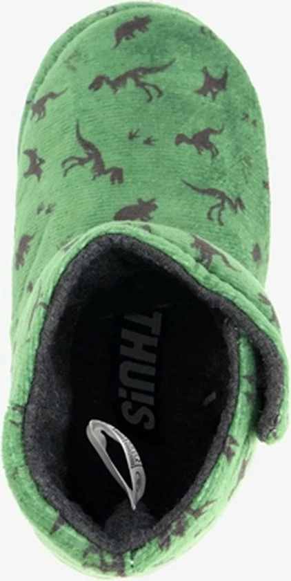 Hoge, groene sloffen voor kids uit de Thu!s collectie. Gemaakt van textiel, een binnenwerk van textiel en een stevige zool. De sloffen hebben een dino print op het bovenwerk en een warme voering.