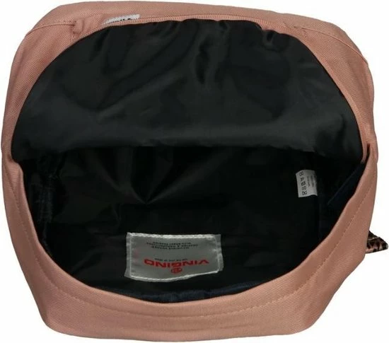 Vingino rugzak. De rugzak heeft een klein vakje aan de voorzijde en een groot vak. beide afsluitbaar met een rits. De tas is oud roze en heeft panterprint details.