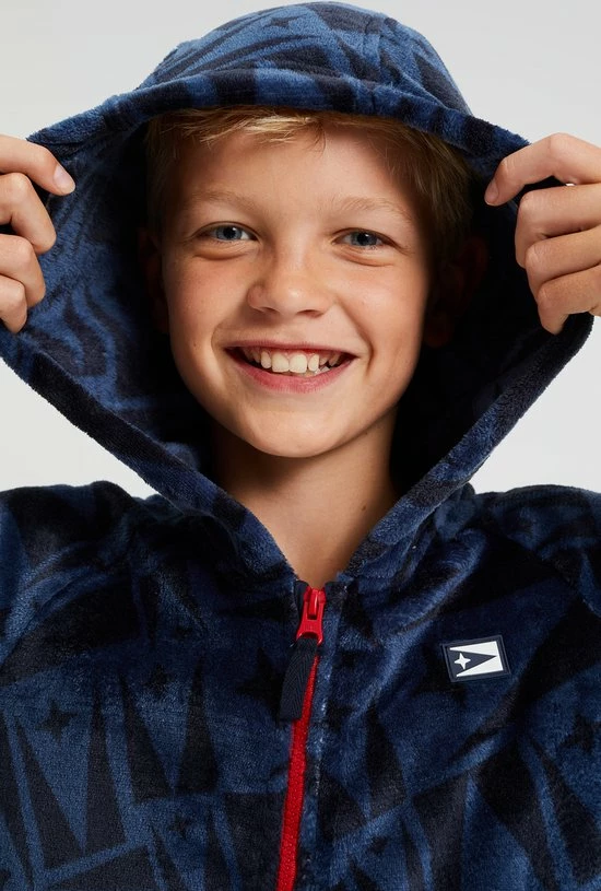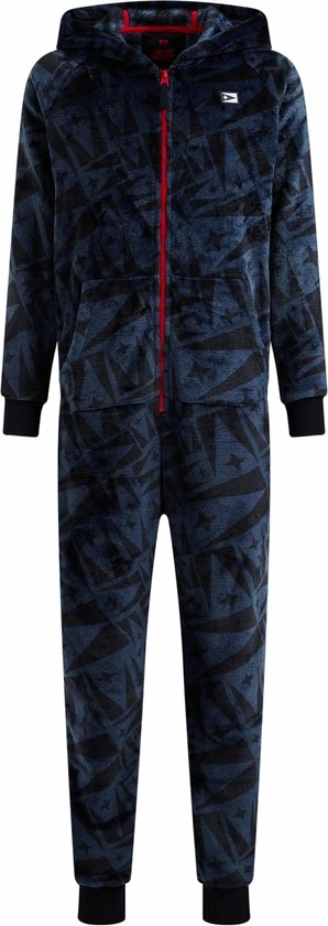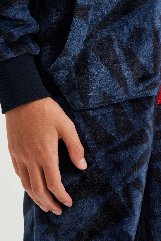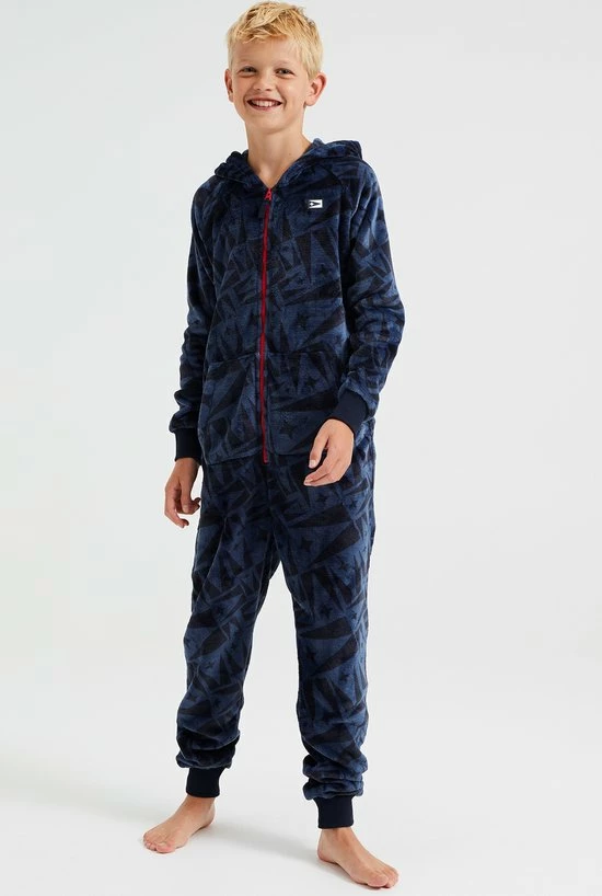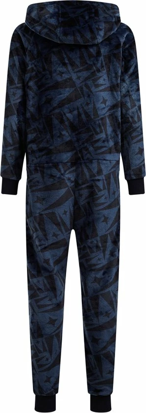 Een regular fit onesie van fleece kwaliteit met een dessin en een ritssluiting. Het model heeft een capuchon, lange mouwen en smalle pijpen.