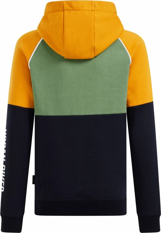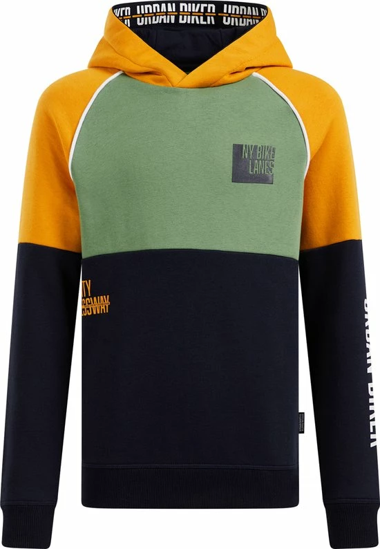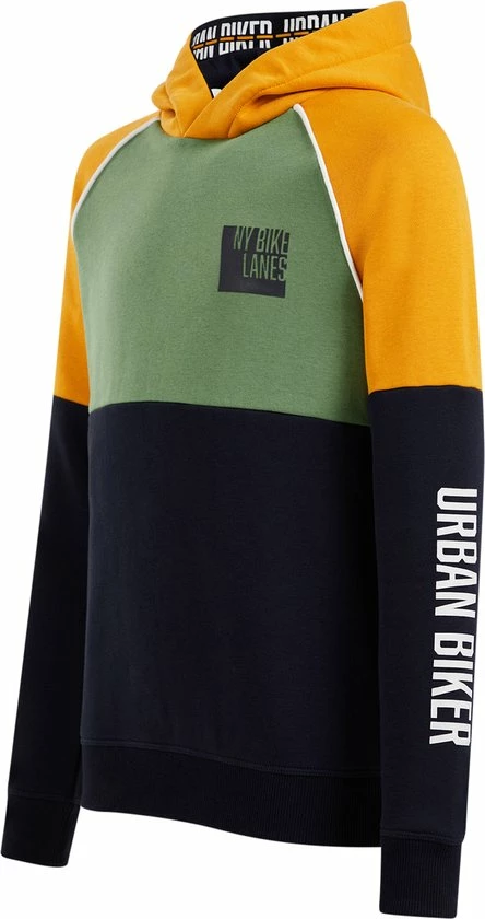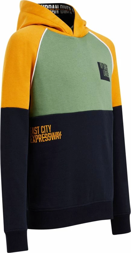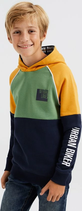 Een regular fit sweater van een katoenmix met colourblock, een fleece voering en opdruk. Het model heeft een capuchon en lange mouwen met geribde boorden.