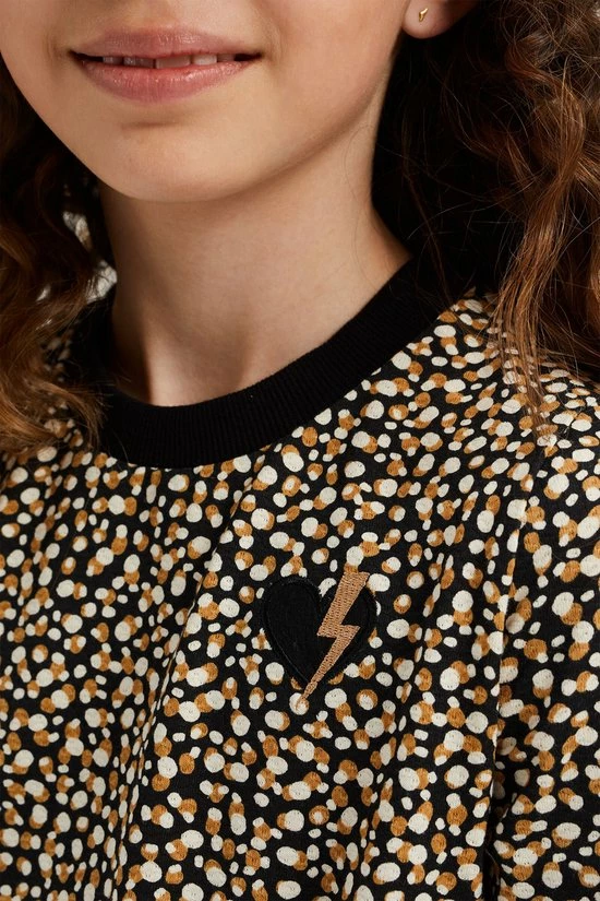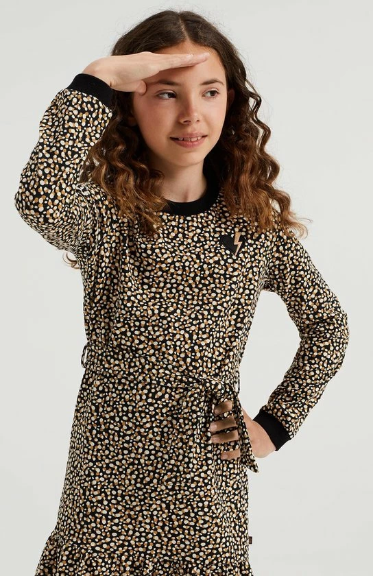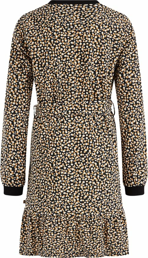 Een regular fit jurk van een katoenmix met een dessin, een strikceintuur en een embroidery op de borst. Het model heeft een ronde hals en lange mouwen met geribde boorden.