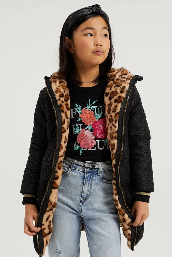 Deze parka kun je aan twee kanten dragen. De ene kant heeft een gewatteerde look met luipaardprint en de andere kant is van imitatiebont met luipaardprint. Het model heeft een ritssluiting met kinberschermer, twee steekzakken met drukknoop en lange mouwen met geribde boorden..