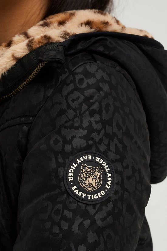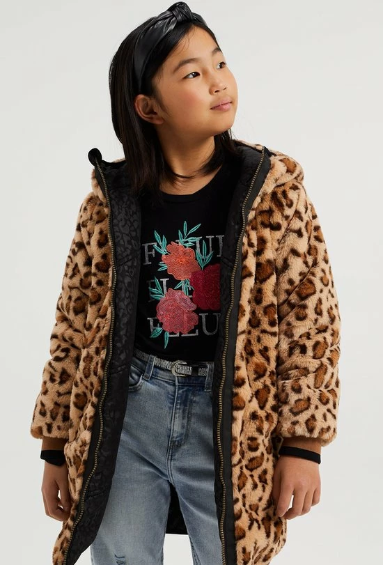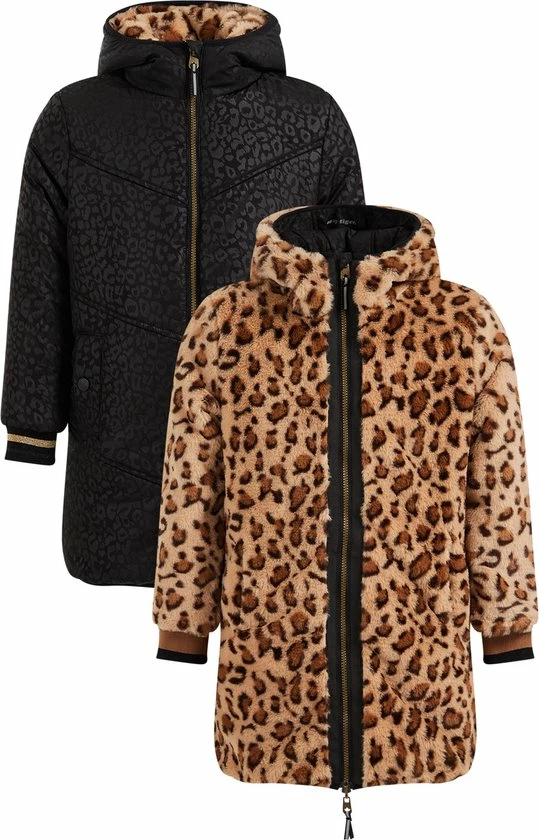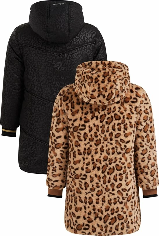 Deze parka kun je aan twee kanten dragen. De ene kant heeft een gewatteerde look met luipaardprint en de andere kant is van imitatiebont met luipaardprint. Het model heeft een ritssluiting met kinberschermer, twee steekzakken met drukknoop en lange mouwen met geribde boorden..