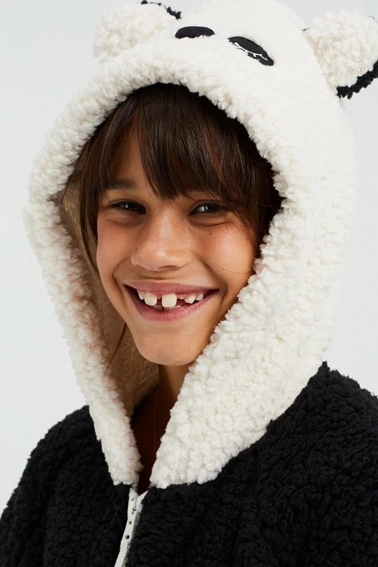 Een regular fit onesie van fleece kwaliteit in de vorm van een beer. De onesie heeft een capuchon met oortjes en een embroidery, een ritssluiting, twee steekzakken en lange mouwen.