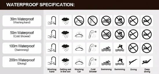 Het horloge is waterdicht tot 5ATM, dit betekent dat hij tegen water kan maar dat je er niet mee kan zwemmen, onder water is het ook niet mogelijk om de knoppen in te drukken vanwege het feit dat het water in de horlogekast kan stromen, graag hier voorzichtig mee zijn en om teleurstellingen te voorkomen.