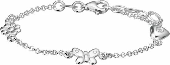 925 Zilveren armband met diverse bedels: bloem, vlinder en hart. De lengte van de armband is 13cm met 2cm extensie en de schakelbreedte is 1.7mm.