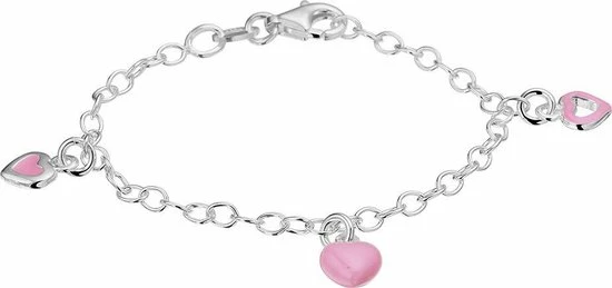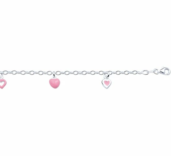 Zilveren armband met 3 hartjes van roze emaille. De armband is onderdeel van een set. De lengte van de armband bedraagt 13cm.